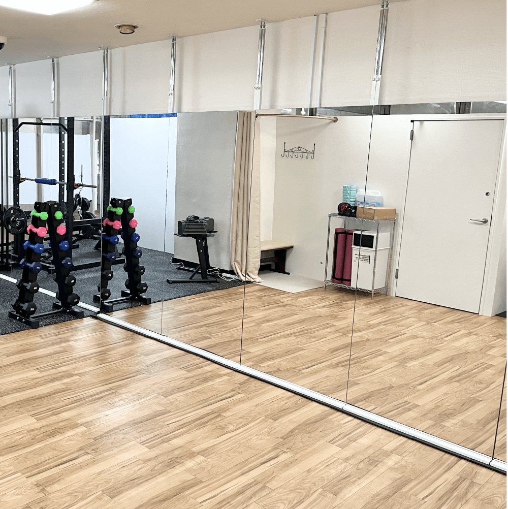 ダンス・ヨガ・ピラティスなどにご利用いただける範囲には、縦180cm横80cmの大型鏡を5枚設置!広々とご利用できます!
